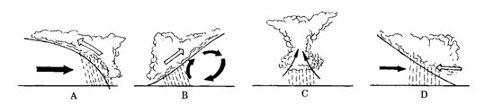 本题解析:我国北方夏季暴雨是由冷锋造成的。图中是冷锋结构的是A项。