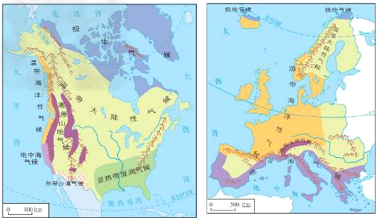 (2)请简要说明本区的该类气候比北美地区分布广泛的原因。