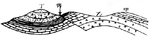 (1)图中甲、乙、丙、丁四处,属于向斜的是 。属于断层的是______。(2分)