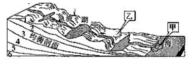【小题1】从图中可以看出:地势起伏大,落差大而形成急流,A错;甲地位于河流入海口,属于河流泥沙淤积而成的三角洲地貌,B正确;图中显示的三角洲及其他地貌均是由外力作用形成的,因此目前该区域以外力作用为主,C错;图中6地层位于4地层之下,说明4岩层形成较早,岩层较新,D错。