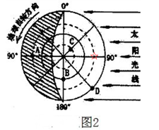 1、综合题 读下面“地球的公转”图,图中字母表示地球在公转轨道上的位置(阴影部分表示夜半球,如C处北极圈内出现极昼现象),回答:(12分)