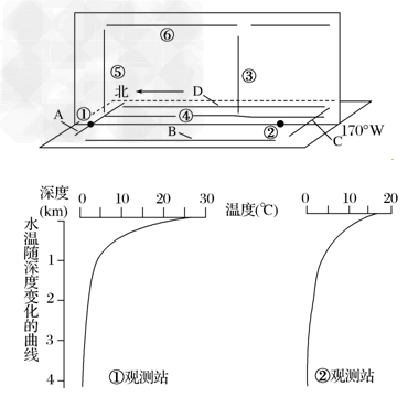 1、综合题 读170°W附近海洋的大洋环流(ABCD)、大气环流(③④⑤⑥)示意图及①②观测站水温随深度变化的曲线,结合图示信息回答下列各题。