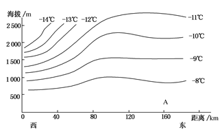 【小题2】正常的大气温度变化应是每升高1000米,温度下降6℃;图中A地500米高空-8℃,2500米高空应为-20℃,即A地上空有逆温现象;由图可知,在距A地60公里处上空有一冷空气,自西向东速度为30千米/时,移动到A地上空应需3-4小时左右,即10时左右。选A正确。