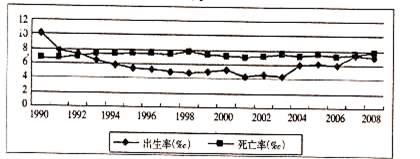 小题1:读图可知该市1992年后出生率低于死亡率,人口出现负增长,但是由于人口总数不断增长,原因是外来人口不断增加;2003年后出生率又出现小幅上升,出生人口略有增加。
