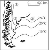 本题解析:图中陆地等温线向南凸出,比同纬度海洋气温高,所以图示应为南半球的夏季。①处主要受安第斯山地的影响;夏季②处增温比海洋快;③处位于海洋,巴西暖流经过,比相邻海区温度高。
