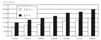 点评:本题难度较小,通过图表考查人口增长及城市化的问题。解答时注意结合1950年、1980年人口柱状图解读该地区的人口增长。通过对人口柱状图的解读来计算城市化的水平高低,城市化的主要标志是城市人口占总人口的比重。