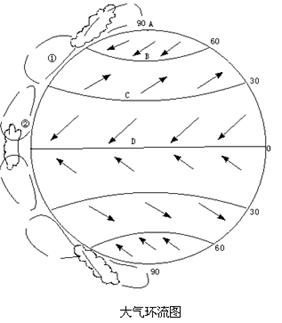 (1)图中各字母所在的气压带名称是: A ;B ;C ; D 。其中盛行上升气流的是 。 (2)根据北半球气压带之间各风带的风向,在图上写出北半球各风带的名称。 (3)极锋是哪两个风带的气流交汇而形成的? (4)用箭头表示北半球三圈环流的方向。 (5)有关气压带、风带的叙述正确的是( )(不定项选择) A.热的地方成低压、冷的地方成高压 B.气压带、风带季节移动的原因在于太阳直射点的回归运动 C.低气压带气流上升,多云雨,高气压带气流下沉,多晴天 D.气压带、风带夏季北移,冬季南移