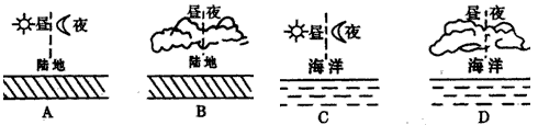 A.东风 B.东北风 C.南风 D.西南风 参考答案: 本题解析: 本题难度:简单 3、单选题 下图中,昼夜温差最小的是