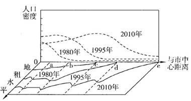 小题1:从图中可以看出,该城市的地租逐年上升,且城市中心地区的地租一般比城市边缘高;城市人口密度在1980年时是城市中心最高,到1995年城市中心人口密度略有下降,人口开始向近郊移动,到2010年城市中心人口密度进一步下降,人口进一步向更远的郊区迁移。故选C。