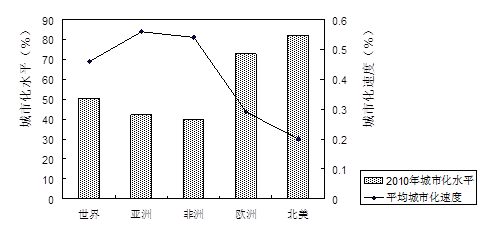 小题1:读图可知柱状图反映亚洲、非洲的城市化水平与城市化速度成正相关,故选项A、不正确。平均城市化速度线显示亚、非洲城市化速度较快。故选项B正确。城市化进程分三个阶段,初期阶段(城镇人口占总人口比重在30%以下)中期阶段(城镇人口占总人口比重在30%到70%之间):成熟稳定阶段(城镇人口占总人口比重在70%到90%之间):选项C亚、非洲总体应处于城市化中期阶段。逆城市化,是指由于交通拥挤、犯罪增长、污染严重等城市问题的压力日渐增大,城市人口开始向郊区乃至农村流动,市区出现“空心化”,以人口集中为主要特征的城市化由此发生逆转。图中信息只显示欧洲、北美的城市化水平的高与城市化速度慢,未能体现逆城市化。