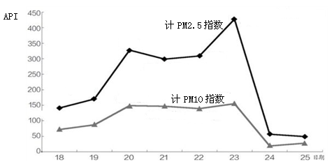 ![]() (1)我国目前使用的空气污染指数项目中的PM10指的是___________________________ ______________________________________________________。 (2)根据材料四数据可知,10月23日美国驻华大使馆自测的计PM2.5指数约为______,属于__________级别的空气质量状况;同日,北京环保局公布的每日空气质量状况属于______________级别。如果你能及时得到美使馆所测数据,你可能于20日和24日分别做出怎样的建议?___________________________________________________________ ________________________________________________________________。 (3)根据材料二,2001-2006年全世界有哪些区域PM2.5污染严重________________ __________________________________________。 (4)我国PM2.5污染最严重的地区是_________________。分析造成这一结果的可能原因是_________________________________________________________________________________________________________________________________________________________________________________________________________________________________。 |