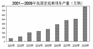 5、单选题 2009年上海国际车展上,展出的新能源车型和清洁能源车型比以往任何一届都多。下图为“2001-2009年我国家庭乘用车产量”图,据此分析回答下列各题。