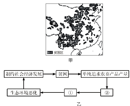 读图甲“中国主要贫困区分布”和图乙“某地区的恶性循环示意图”,回答下列问题。
