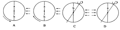 本题解析:根据背对阳光一侧为夜半球;顺着自转方向,经过晨线由夜半球进入昼半球;经过昏线由昼半球进入夜半球,故判断A图上a为昏线,b为晨线,错误;B图上a为晨线,b为昏线;C图上b为晨线;D图上a为昏线。
