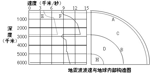 (1)横波速度慢,横波只能在固态中传播。图中E波速度慢,在2900km处突然消失,可判断E波为横波。纵波速度快,可以固、液、气三态中传播,F波为纵波。