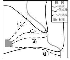 小题1:图中数码代表的四条引水线路中,河水可自流入村的是