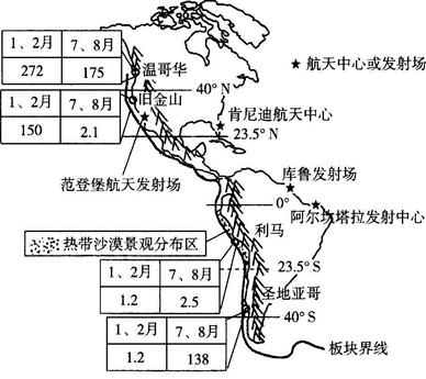 (1)简述图示区域沿36°N纬线的降水分布特点,并解释其原因。(8分)