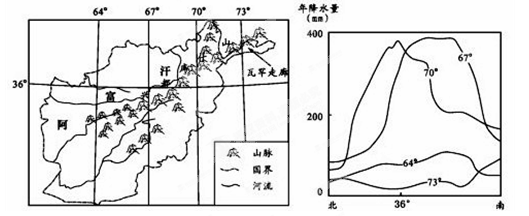材料二:阿富汗附近地区略图(图左)及沿图中四段经线的年降水分布曲线图(图右)。