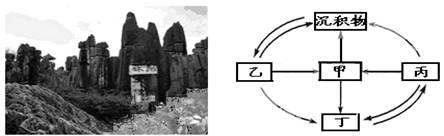 【小题1】喀斯特地貌一般是在湿热气候条件下,可溶性的沉积岩如石灰岩经流水侵蚀(溶蚀)所形成的,右图中沉积物形成乙,说明乙是沉积岩。