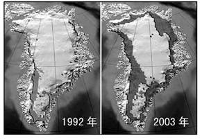 4、单选题  据新加坡《联合早报》网站10日报道,科学家指出,格陵兰岛和南极冰盖融化的速度正迅速加快,成为全球的海平面上升的主要原因,下图是格陵兰岛2002年与2010年冰架对比图,回答题