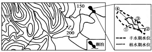 点评:在等高线地形图中,等高线的疏密可以判断坡度的陡缓,一般为密陡疏缓。图中的洪水位和枯水位可以看成是两条等高线,即可得出答案。瀑布是在地势落差大且有河流经过的地方形成的,且观赏瀑布的最佳位置在瀑布的下方。我国雨带的移动规律一般为4、5月份登陆,6月中旬到7月中旬到达江淮地区,形成梅雨,7、8月份到达华北、东北地区,9月份开始南移,10月份基本退出中国大陆。而长江中下游地区在7、8月份受到副高的影响形成伏旱。