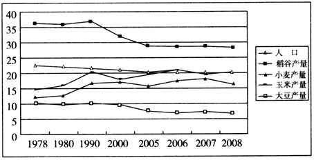 1、单选题 下图为我国人口、稻谷产量、小麦产量、玉米产量、大豆产量占世界比重随时间变化曲线图,据此回答1~2题。