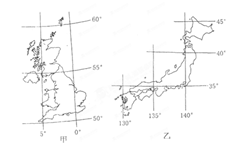 小题1:图示甲为英国,由于位于大陆西岸,终年受盛行西风影响,故形成温带海洋性气候。而乙为日本,由于位于大陆东岸,受季风环流影响,故形成季风气候。