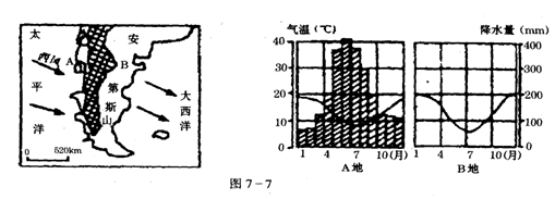 参考答案:(1)多?少? A地位于安第斯山以西,是来自太平洋的盛行西风(或西北风)的迎风坡,降水多,B地位于被风坡,降水少。?地形和西风带(2)7? 1?两地都位于南半球,南、北半球的季节相反。