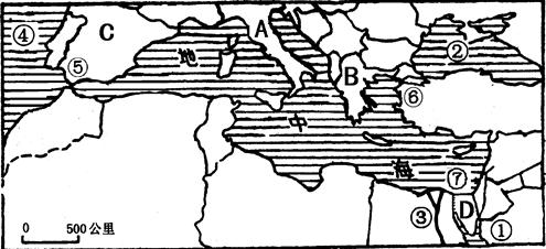 4、综合题 读地中海地区示意图,回答有关问题:(6分)