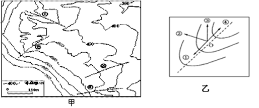 小题2:乙图为甲图中某地一部分,实线为等高线,虚线为泥石流路线,某游客此时刚好位于O点,则其最佳的逃生路线是图中①~④中的