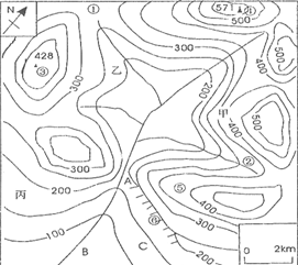 (4)A、B两河间开挖运河时并没有选择距离较近的①②点间直线施工的原因是什么?(2分)