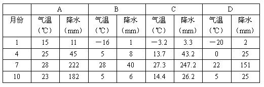 2、单选题 下表的四个地点分别位于我国的四个地区内,读它们的部分气候资料,回答1—2题。