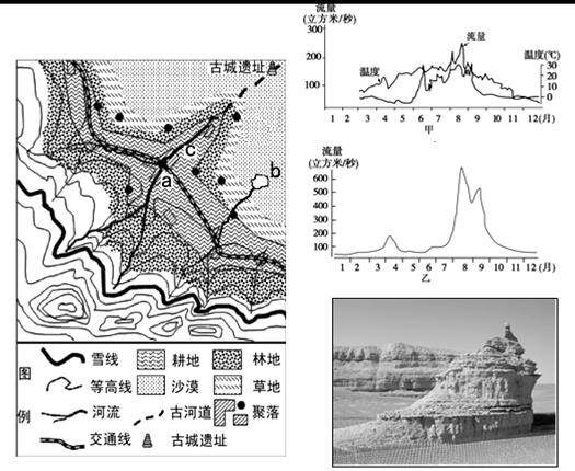 3、综合题 左下图为“我国西北某地区土地资源及聚落分布图”,右下图为“两条河流径流量变化图”,读图回答下列各题(22分)。