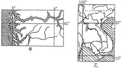 A. A、B两国间矛盾冲突激烈的历史原因是淡水之争 B. A国是以山地为主的国家 C. B国南部与同纬度地区相比,气温偏高的原因主要是受北部山地的阻挡 D. 东南季风的强弱,易使B国造成洪涝或干旱 参考答案: 本题解析: 本题难度:一般 2、单选题 读甲、乙两图回答题。 |