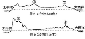 小题1:结合图示的纬度位置和地形剖面分析,图A表示北美洲,故落基山脉为①;图B表示南美洲,安第斯山脉为③。