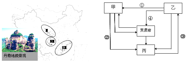 【小题1】仔细读图,M区主要为干旱和半干旱地区,A错;N区河流位于我国季风区,主要参与海陆间水循环,B错;K区位于我国东南地区,地貌形成的主要外力是流水,C对;由图中,丙处箭头有“三进一出”的特点,为岩浆,乙为岩浆岩。而丹霞地貌的岩石类型为沉积岩,D错。答案选C。