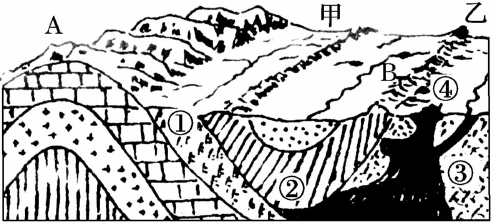 (2)甲乙两处的山地都是??(流水或风力)的??(侵蚀或沉积)作用形成的。