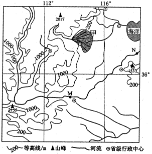(3)图示范围内,黄河在M点以上河段流经地区最主要的环境问题是什么?请在图中用一箭头线大致画出南水北调中线工程的输水路线。(2分)