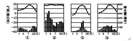 【小题1】读图,根据气温曲线与降水柱状图分析,①地最冷月气温在0度以上,夏季炎热干燥,冬季温和多雨,是地中海气候。②地全年高温多雨,是热带雨林气候。③地最冷月气温小于0度,位于温带,降水集中在夏季7、8两月,是温带季风气候。④地是亚热带季风气候。所以B对。