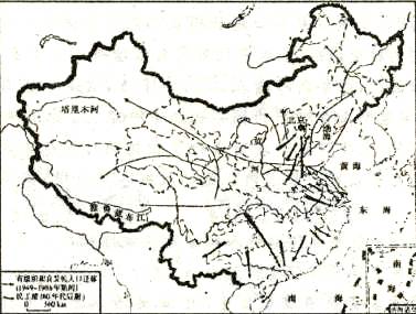 4、综合题 读1949年以来我国国内人口迁移的主要流向图,回答下列问题。