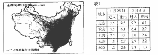 A.大量农村劳动力闲置 B.1984年,国家放宽对农民进入小城镇落户等政策 C.城乡地区之间巨大的收入差距 D.城市生活环境质量好 2、单选题 百度迁徙是利用百度LBS(基于住置服务)开放平台进行计算分析,用于展现人口大迁徒轨迹与特征。下图为2014年春节假期前后某日百度迁徒地图,下表为此期间部分大城市日迁移人数占同日全国迁移人口的百分比。据此回答下列小题。 |