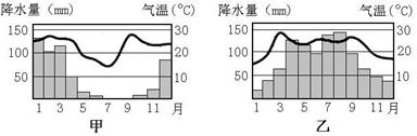 原因:东非高原属于热带草原气候,一年分干湿两季;(1分)7月份乙地正值草原气候的雨季,草类茂盛;而此时,甲地正值草原气候的干季,草类枯黄。(1分)