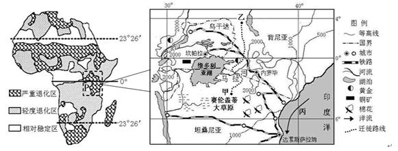 材料一 非洲生态退化程度分布图及东非高原局部区域