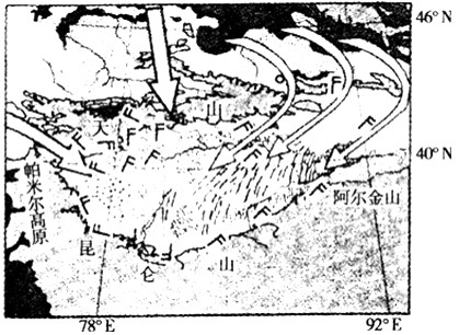 4、单选题 下图反映了塔里木盆地中沙尘暴形成时的风场状况,读图完成1~2题。
