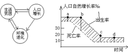 A.中国 B.印度 C.加拿大 D.巴西 参考答案: 本题解析: 本题难度:一般 2、单选题 “PPE怪圈”是指贫困(Poverty) 、人口(Population) 和环境(Environment) 之间形成的一种互为因果的关系,如下图所示。 A.a?B.b?C.c?D.d 参考答案:B 本题解析:根据题干信息,贫困、人口增长和环境退化三者之间互为因果关系,结合所学知识可知人口增长往往是贫困和环境退化的根源。图中显示b点人口自然增长率最高,可能会出现由于人口高增长导致对生态压力过大现象,从而陷于题中所说的怪圈之中 本题难度:简单 3、单选题 到21世纪中叶以后,我国有可能出现人口负增长,其主要原因是( ) 参考答案:C 本题解析:到21世纪中叶以后,随着我国老龄化问题越来越突出,老年人口比重大,导致死亡率上升,我国有可能出现人口负增长。 本题难度:简单 4、单选题 读下面人口增长模式图,回答3~4题。 |