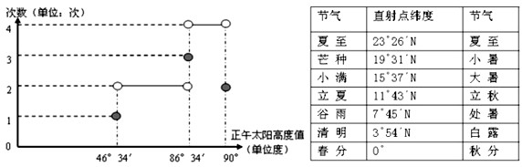 1、单选题 下图为北半球某地一年内正午太阳高度不同值出现的频次图(实线和黑点代表实际存在),表为我国夏半年各节气太阳直射点的纬度值。读图和表,回答1~2题。