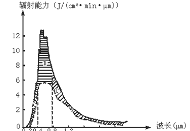 2、单选题 太阳辐射中可见光的波长约为0、4-0、76微米,小于0、4微米为紫外区,大于0、76微米为红外区。下图为近地面(虚线)和大气上界(实线)太阳辐射波长分布示意图。读图并回答下列各题。