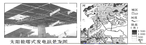 4、单选题 亚洲首座MW(兆瓦)级太阳能塔式热发电站即将在北京延庆县竣工。届时将建成一座100米高的太阳能吸热塔,并在208亩地面上摆放100面自动追踪太阳光的大型反光镜,(即“定日镜”,参见左图),反射聚集阳光到吸热塔内,再转化成电力。据图文材料完成下列问题。