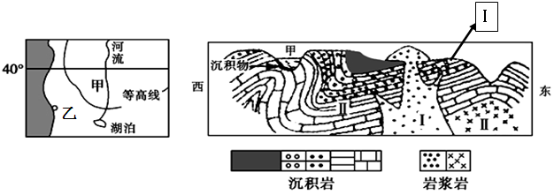 【小题1】根据左图等高线凸出方向,可以判断河流源头是湖泊,自南向北流。根据右图中甲河西岸有泥沙沉积,说明东岸受流水侵蚀,东岸是河流右岸,说明河流受向右的地转偏向力,应位于北半球;湖泊是河流源头,是河流的水源补给地,乙地纬度低于40°且位于大陆西岸,属于地中海气候。