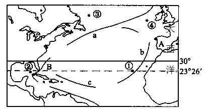 (1)考查洋流的类型和成因及对地理环境的影响。风海流主要动力为盛行风带。根据洋流分布和风带的分布,图中属于风海流的是a——北大西洋暖流,西风带影响;c——赤道暖流,东北信风带影响。暖流具有增温增湿的影响。